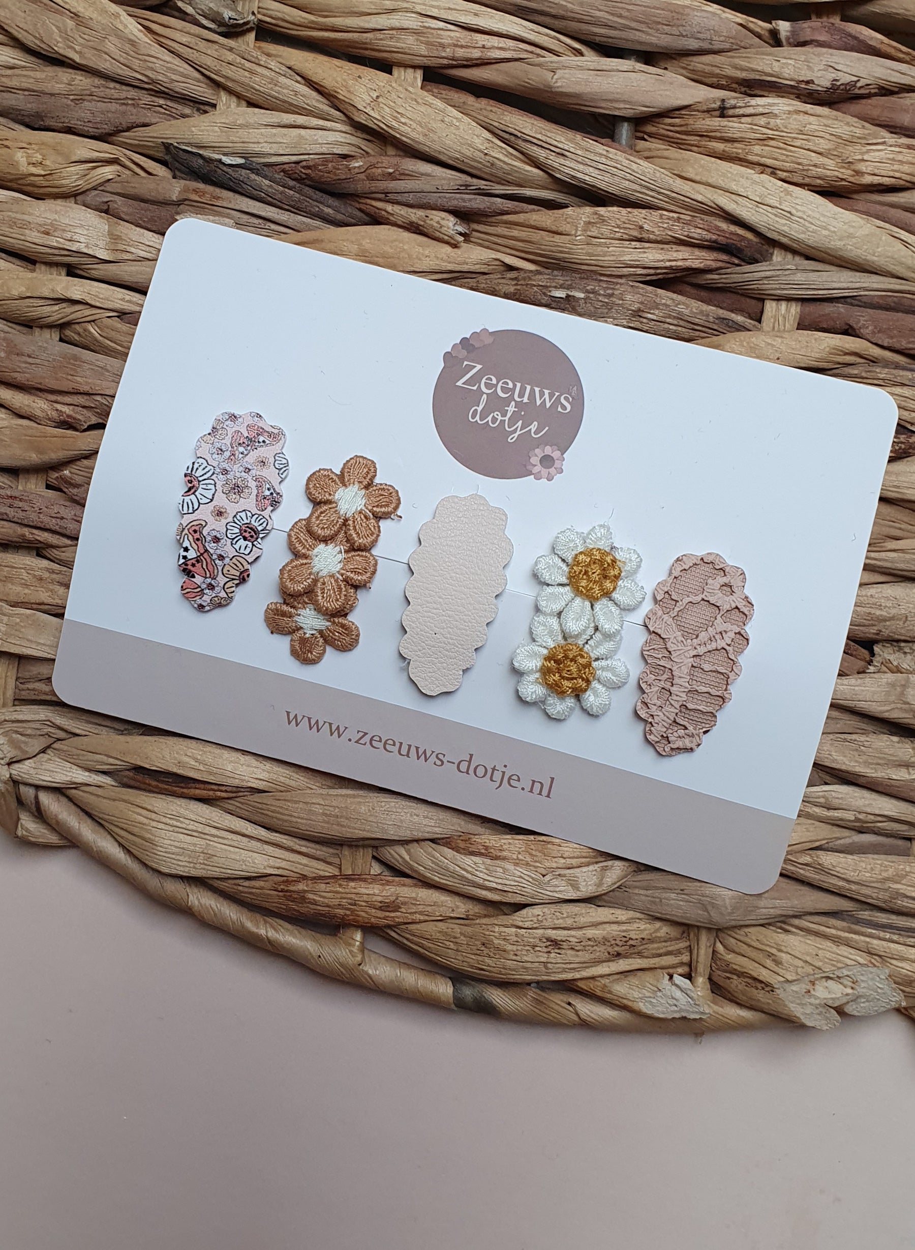 Ben je op zoek naar haaraccessoires die zacht, tijdloos en van hoge kwaliteit zijn? Deze 5-delige set van Zeeuws Dotje is uitgevoerd in een prachtig natuurlijk kleurenpalet van bruin, roze, wit en beige. Een rustige combinatie die perfect past bij elke outfit.