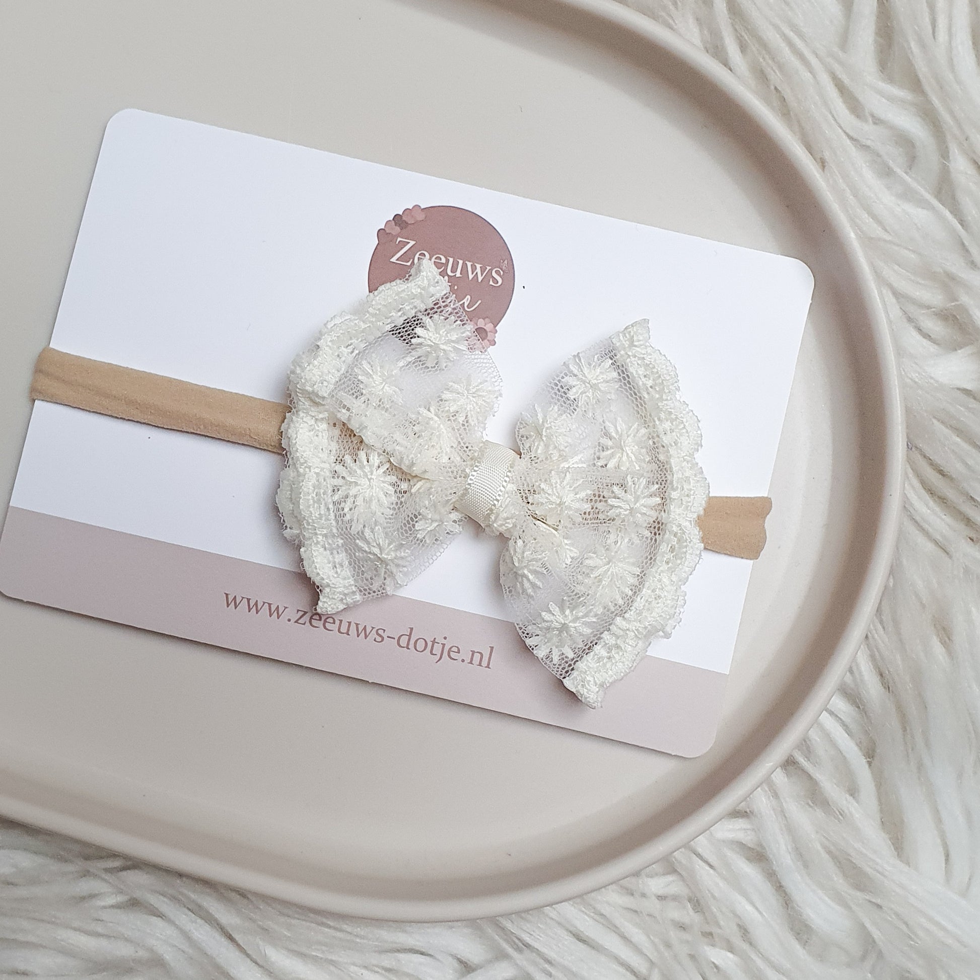 Prachtige offwhite kanten strik, bevestigd op een haarbandje voor de kleine meisjes. De strik is 6 cm breed ongeveer! De prijs is per stuk.