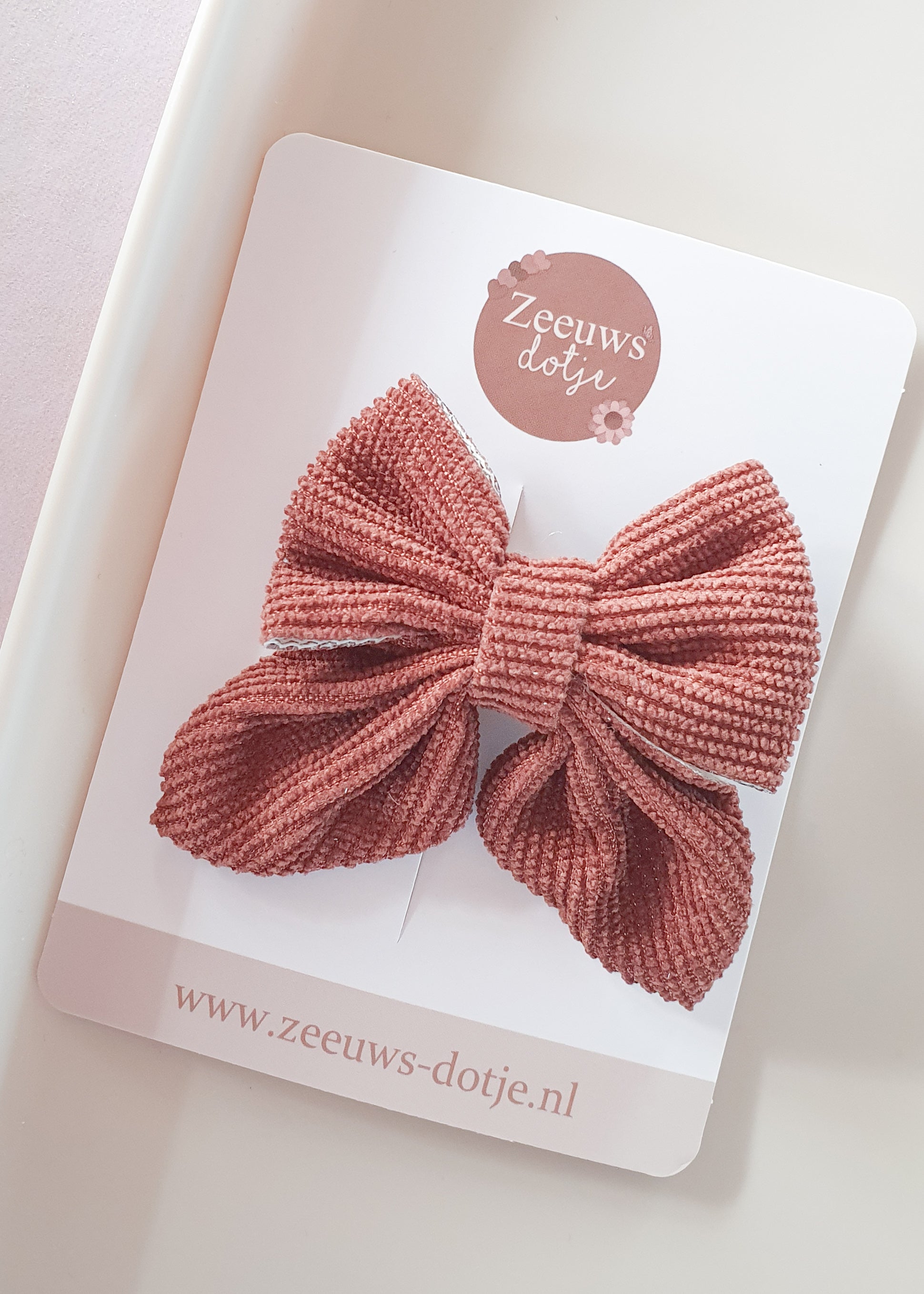 Schattige retrobruine strik van ribstof! Zacht en echt een musthave voor de winter! De strik zit op een 4,8 cm alligator clip.