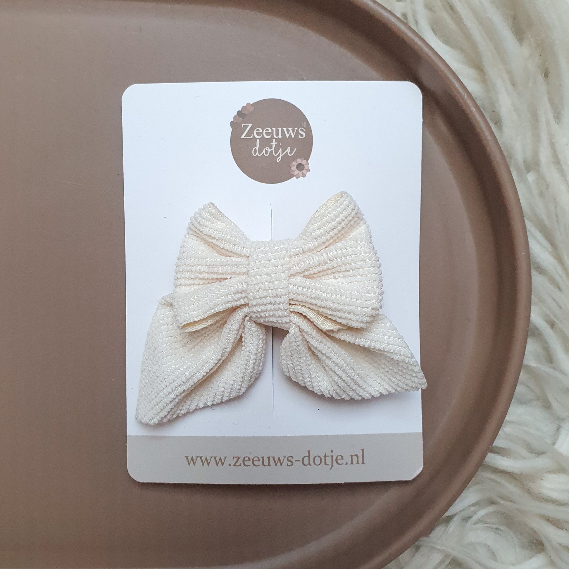 Schattig beige strik van ribstof! Zacht en echt een musthave voor de winter! De strik zit op een 4,8 cm alligator clip.