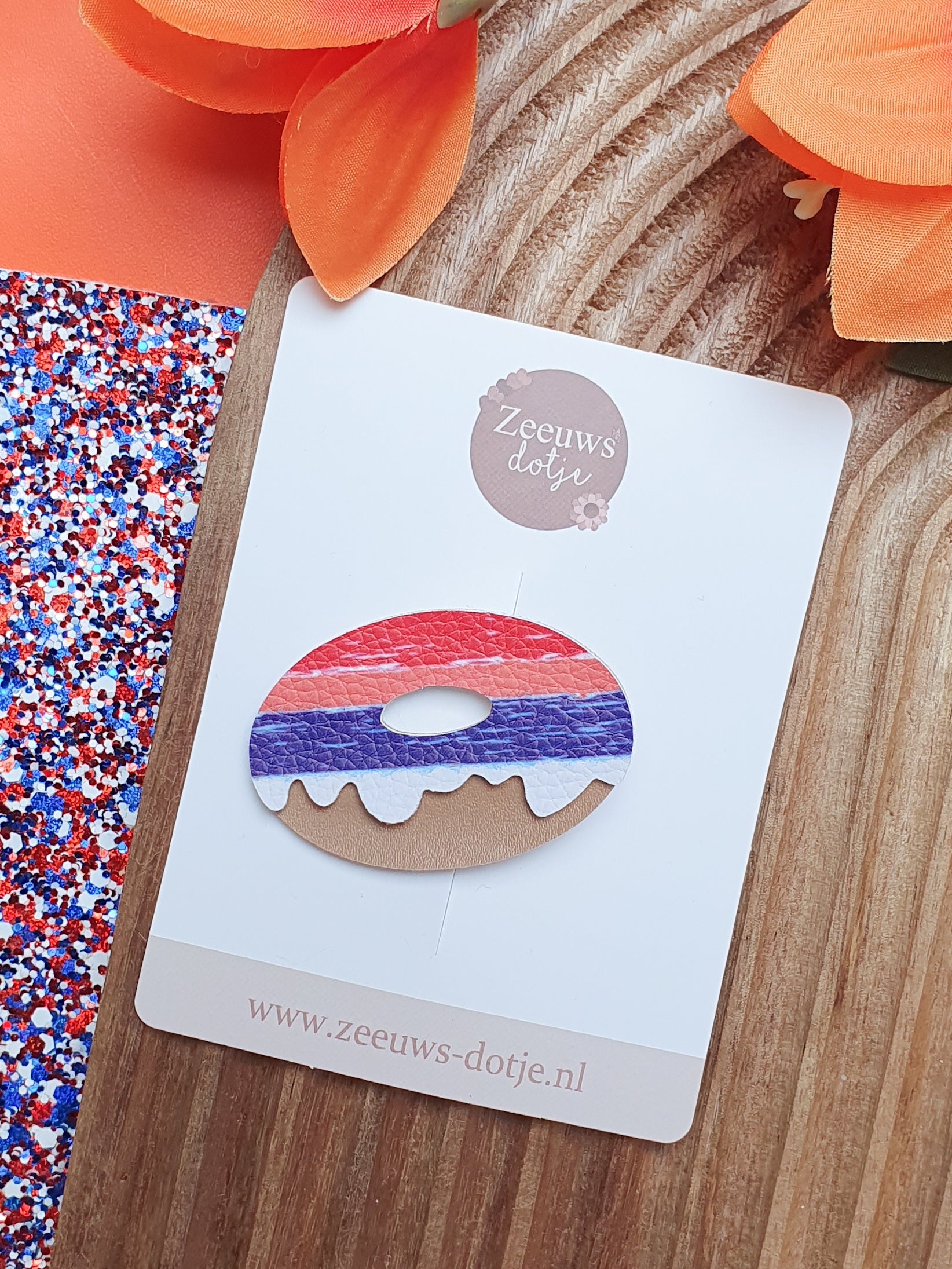 Zeg nu zelf, ziet dit er niet heerlijk uit? Speciaal voor Koningsdag en de Koningsspelen hebben we dit té gekke donut-speldje gemaakt. Uitgevoerd in de Nederlandse vlagkleuren: een rood-wit-blauw geglazuurde donut op een stevige alligatorclip. Een zoete touch voor elke feestelijke outfit!