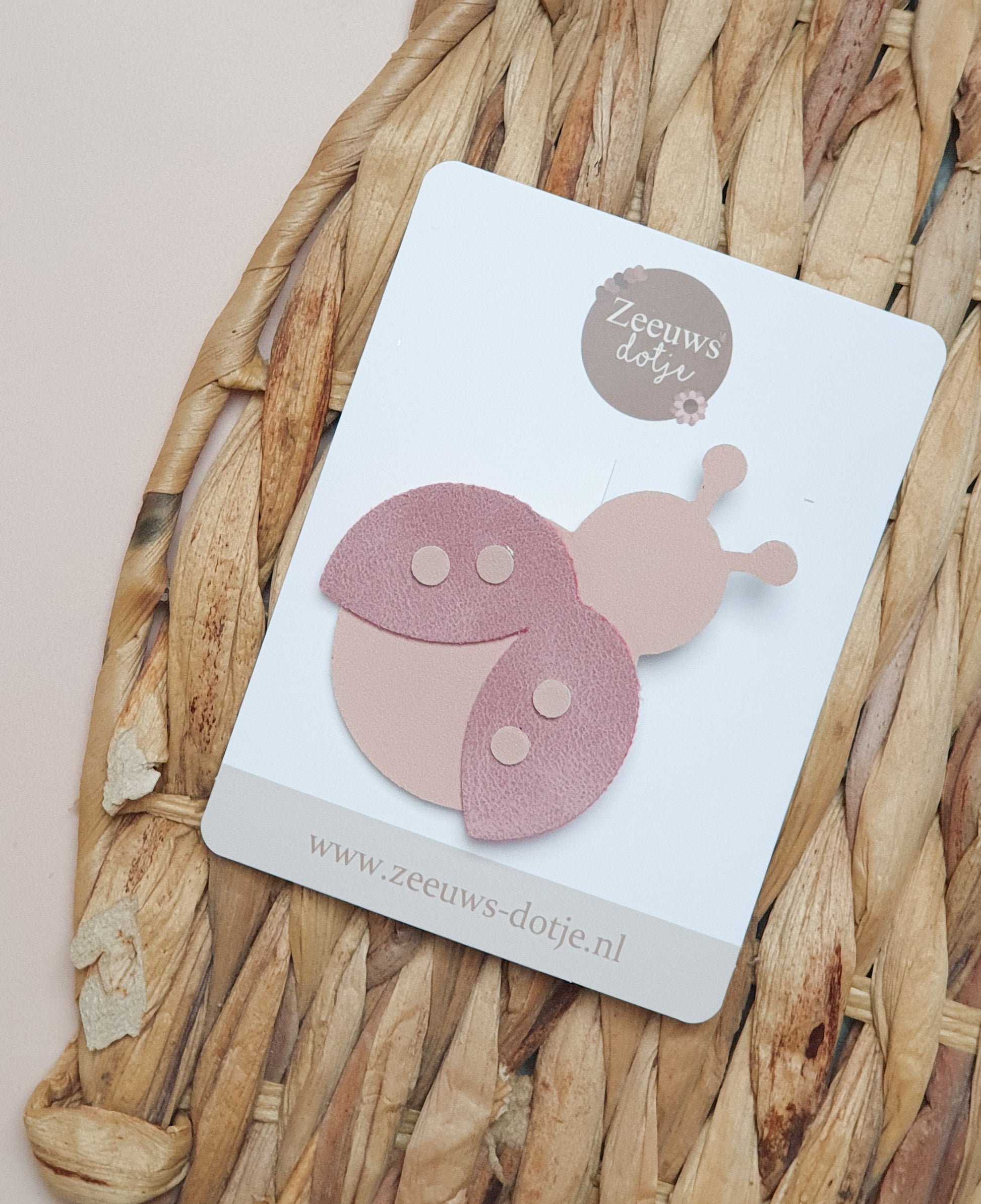 Met veel trots presenteer ik je mijn nieuwste ontwerp. Dit schattige lieveheersbeestje heb ik zelf met de hand uitgesneden uit prachtig, zacht leer. Ik noemde haar: Sproetje