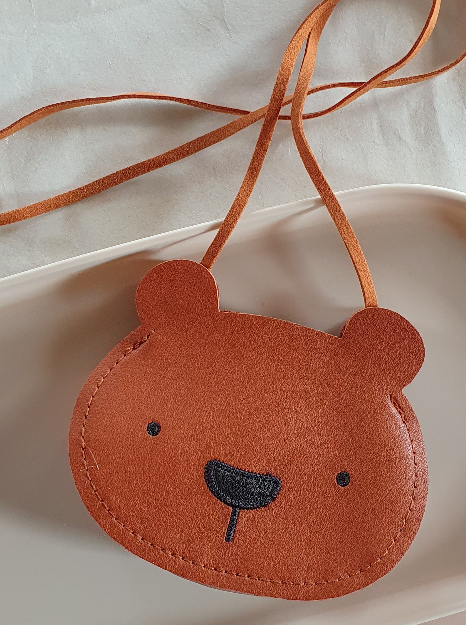Super leuk lederen tasje in de vorm van een schattig beertje. Het tasje heeft lang hengsel zodat het schuin over de schouder kan worden gedragen. Het tasje is ongeveer 14 x 10 cm