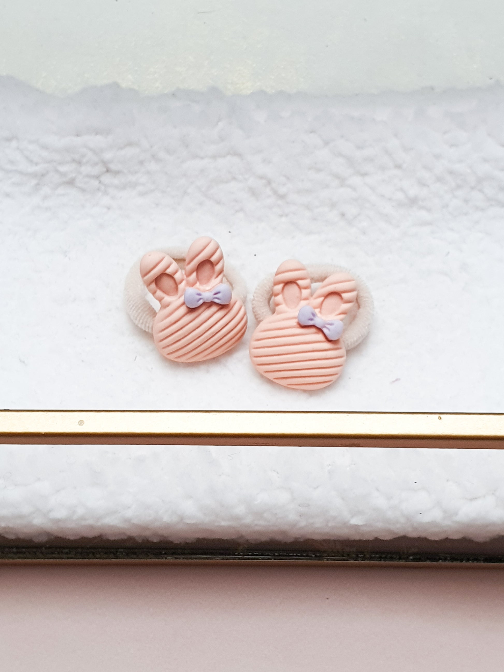 Lief design: Perzikkleurige konijntjes met een ribbeltextuur en lila strikje.