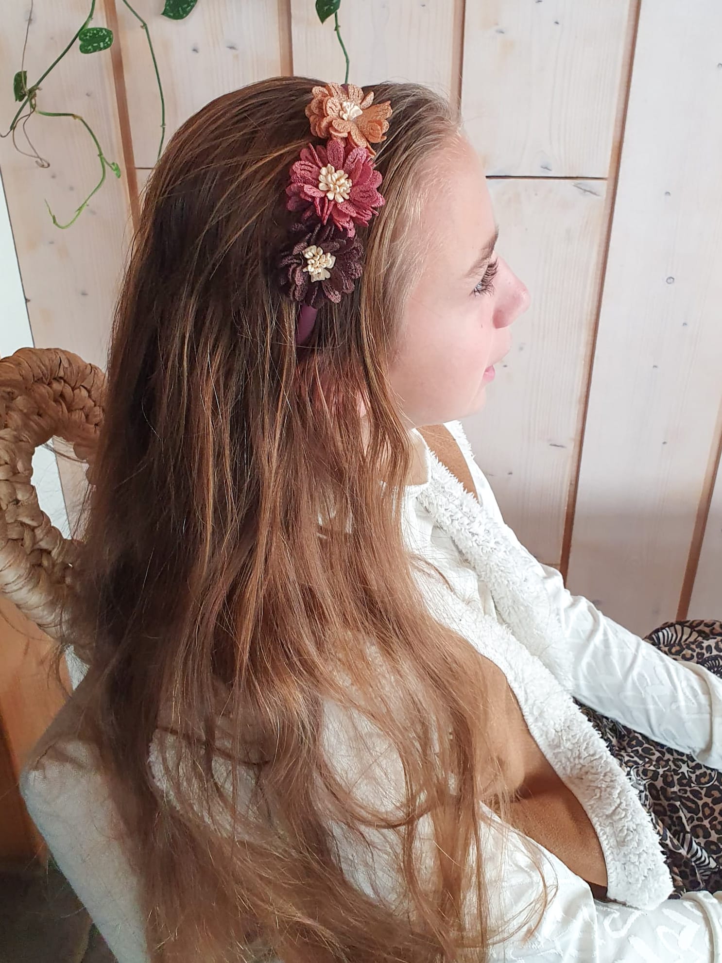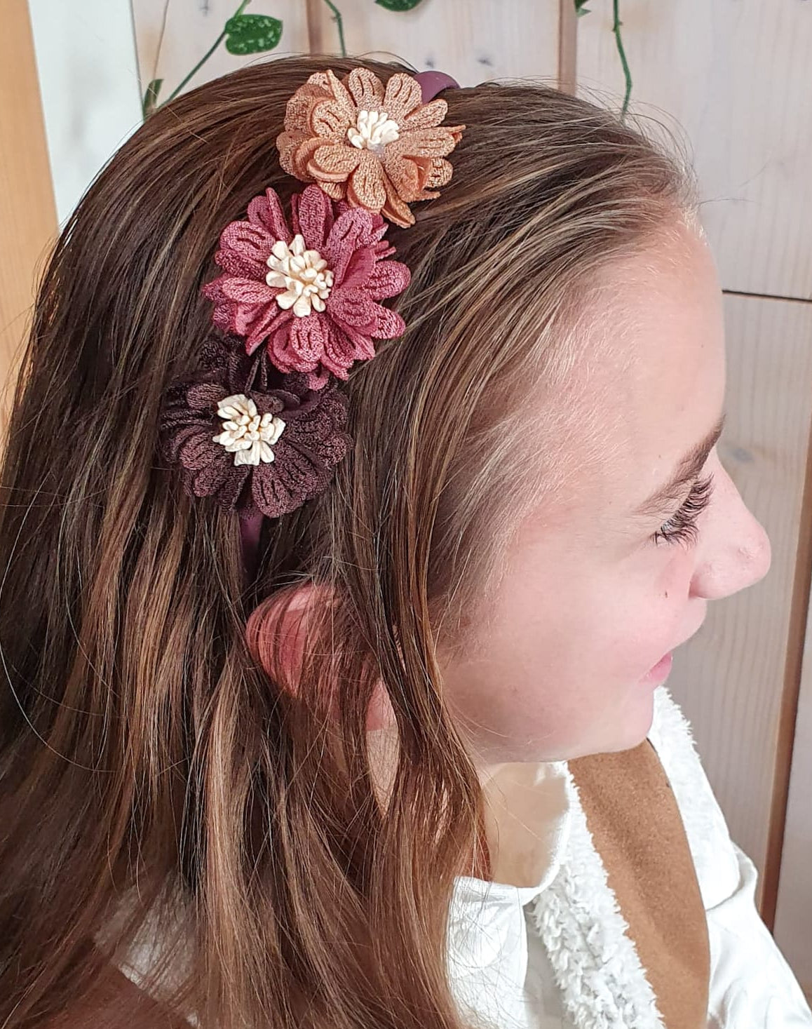Een purple diadeem met "tandjes" erin, zodat hij goed blijft zitten. Er zitten 3 grote bloemen op, in de kleuren zand & chocoladebruin & donkerroze/ purple. De diademen zijn geschikt voor meisjes met wat meer haar, vanaf 1,5 a 2 jaar.