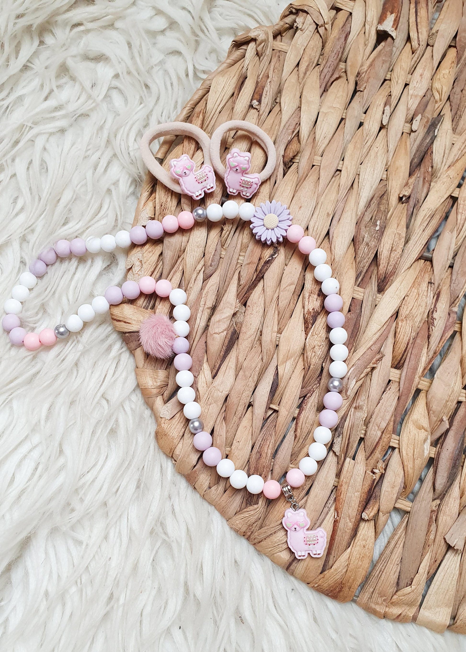 Is jouw kind ook zo’n fan van alpaca’s? Deze vrolijke set is een feestje om te dragen! De ketting is opgebouwd uit kralen in prachtige pastelkleuren zoals lila, wit en zachtroze. Met de extra details zoals het paarse bloemetje, de fluffy roze pompon en de alpaca met zonnebril is dit het perfecte cadeau voor elke kleine trendsetter.