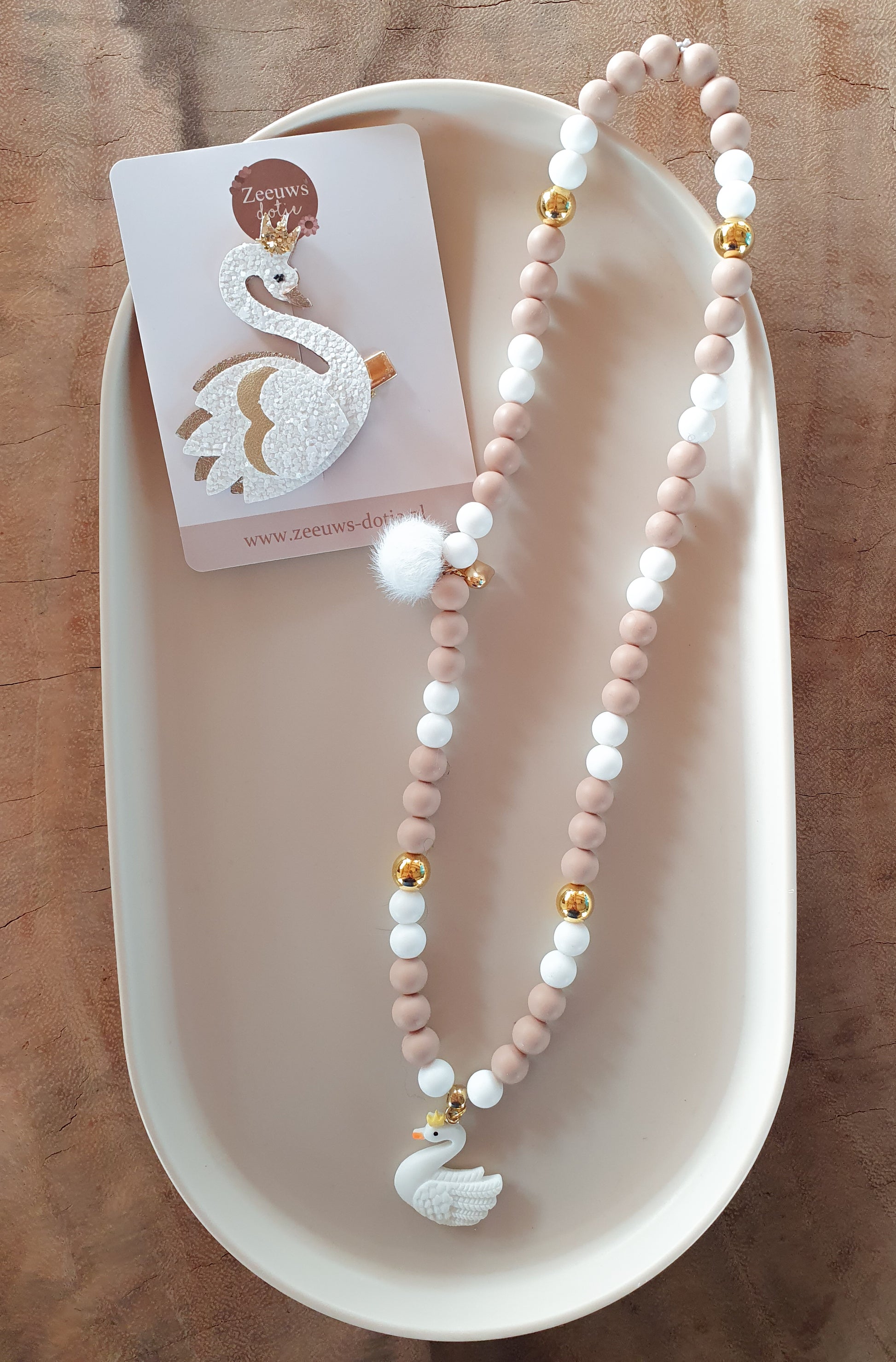 Deze fantastische zelf ontworpen zwanen ketting met een bijpassende haarspeld maakt de outfit van jouw meisje helemaal compleet.Β Want wie bewonderd de zwaan eigenlijk niet? Daarnaast zijn ze super hip en eigenlijk niet meer weg te denken uit de garderobe van jouw dotje.