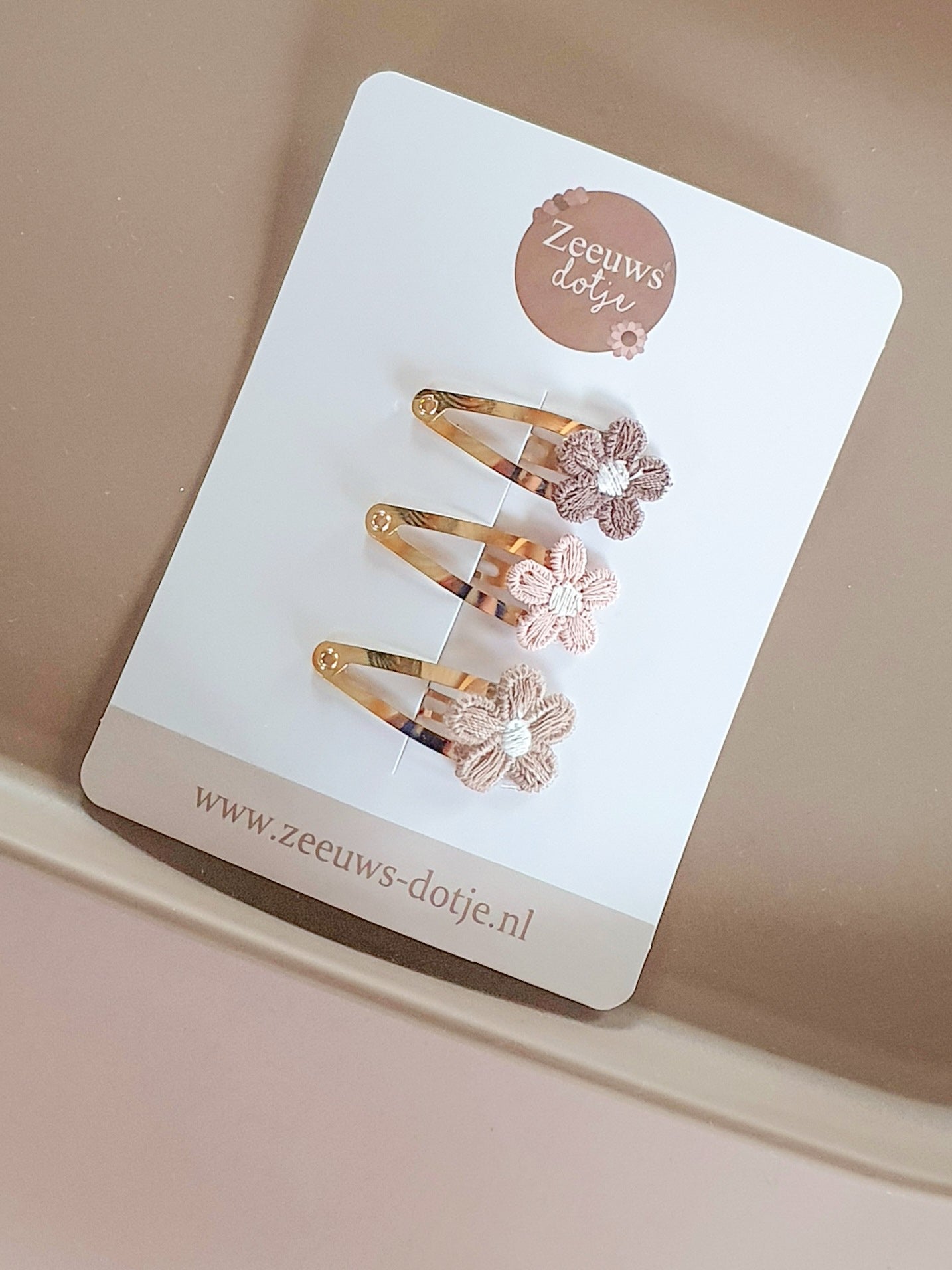 Set van 3 haarspeldjes met lieve kleine bloemetjes in warme tintjes. De speldjes zijn 3 cm.