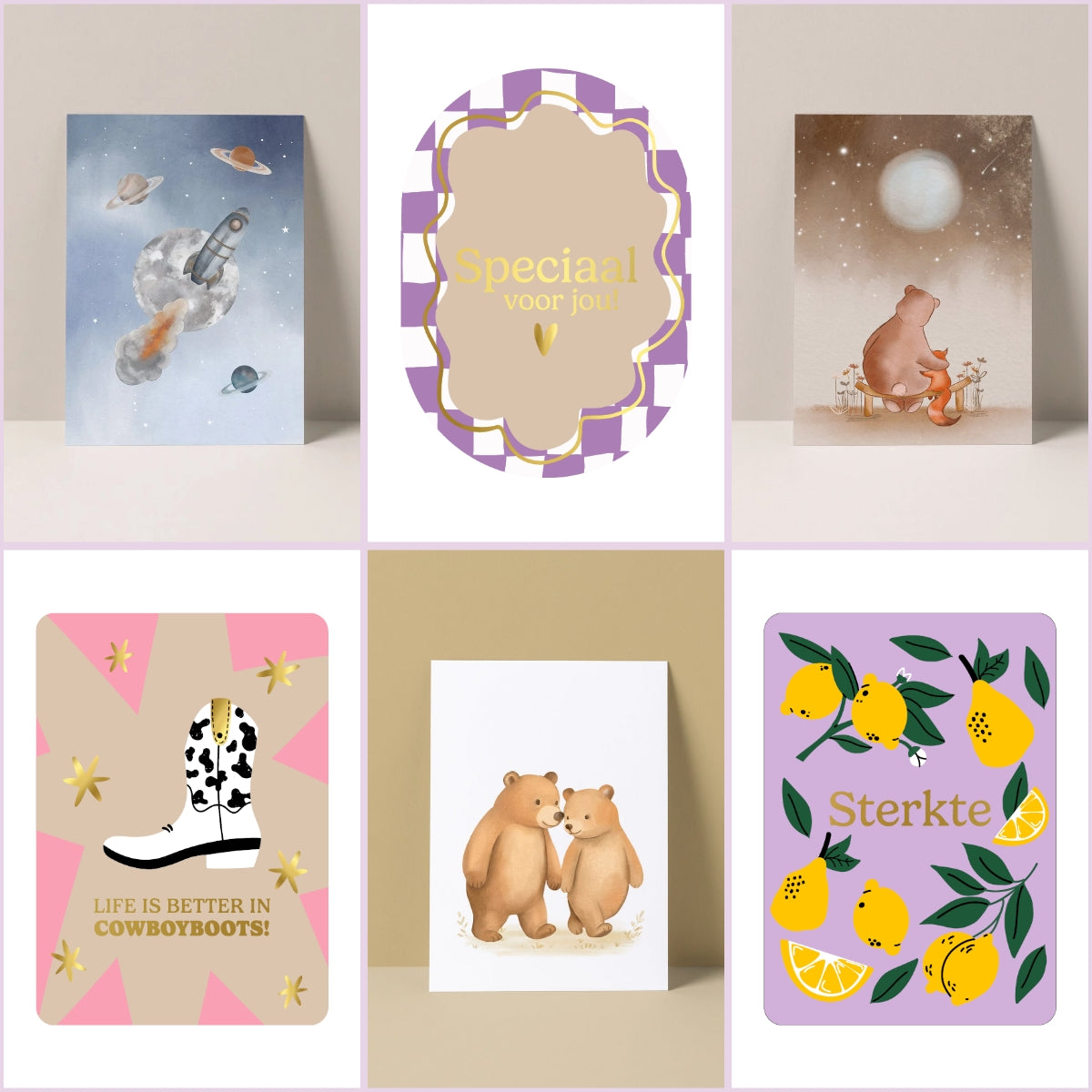 ✨ Stuur een sprankje magie! Kun je niet kiezen tussen onze stoere goudfolie-kaarten en de tederheid van Studio Poppybird? In dit setje komt alles samen. Van een avontuurlijke reis naar de ruimte tot een warme knuffel onder de maan; deze collectie is gemaakt voor dromers van alle leeftijden.